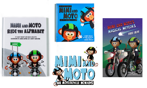 a vibrant and colorful children’s motorcycle book geared for ages 1-3. Mimi and Moto are adorable monkeys that ride dirtbikes, sportbikes, choppers, cruisers, caferacers, and even a sidecar!